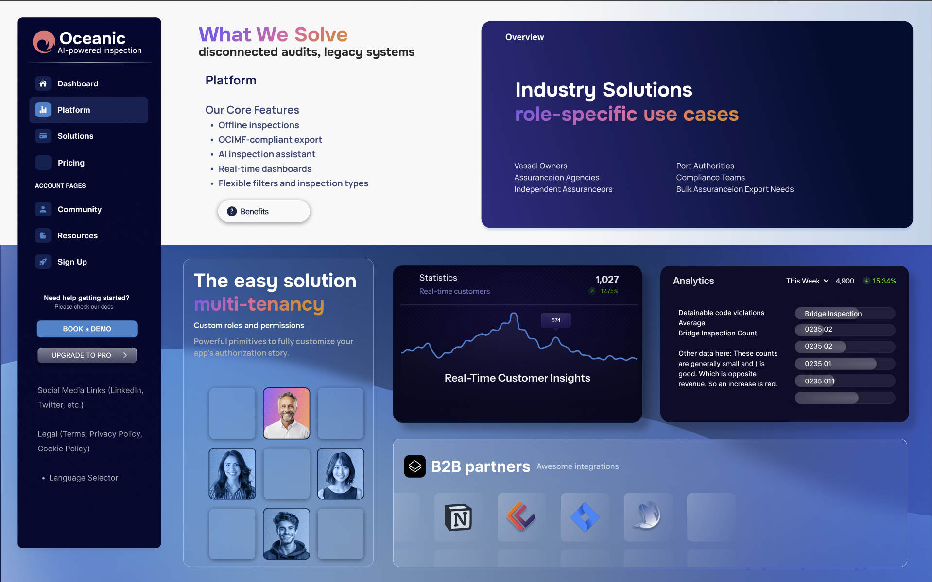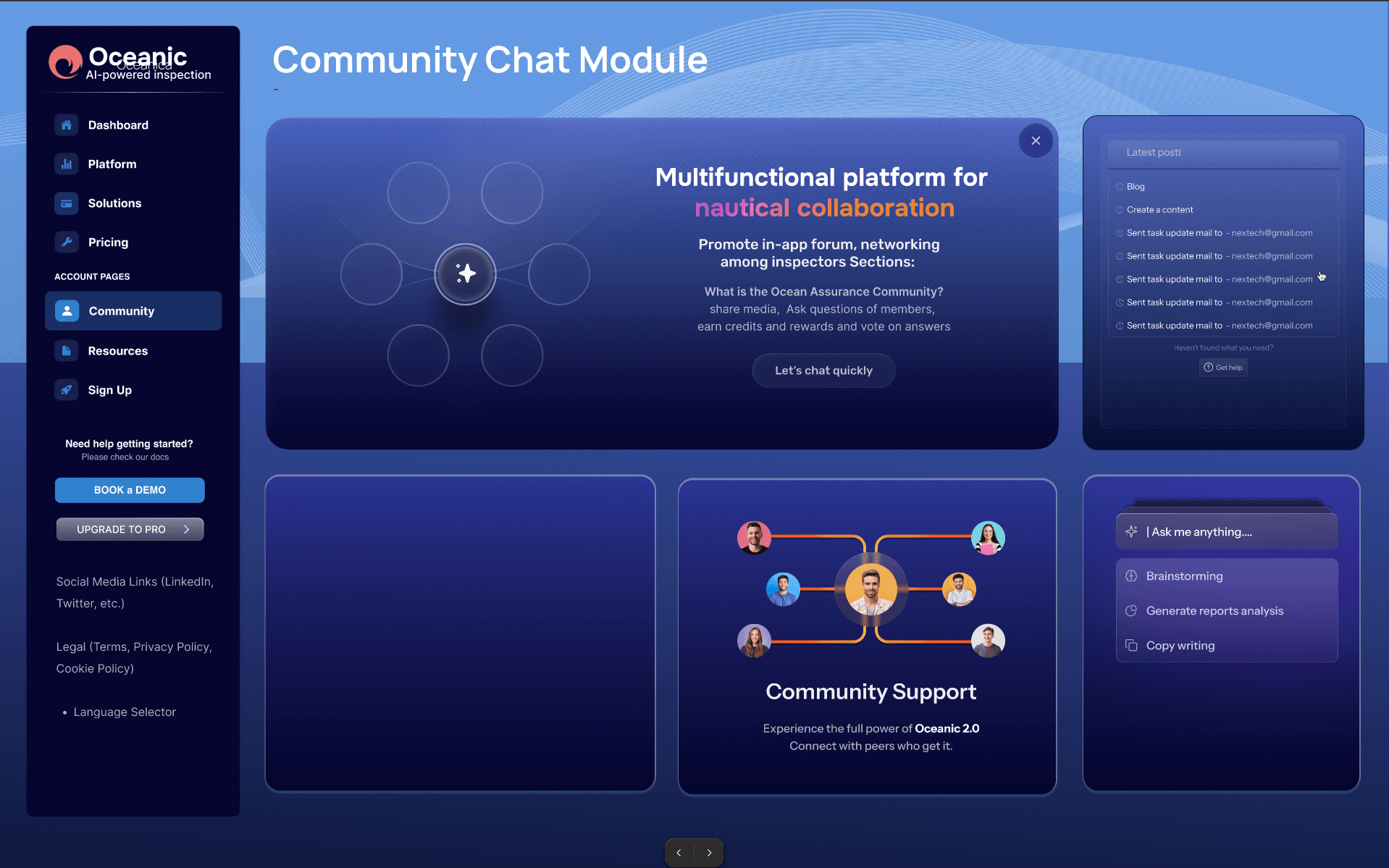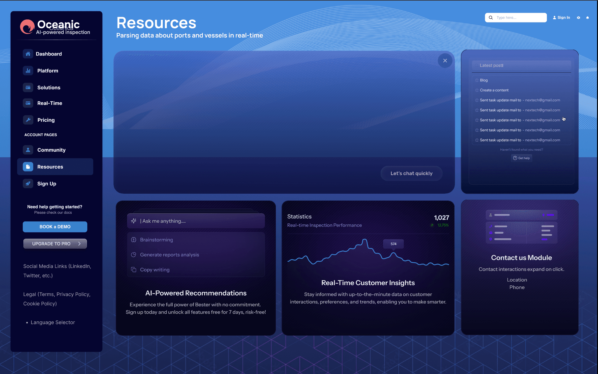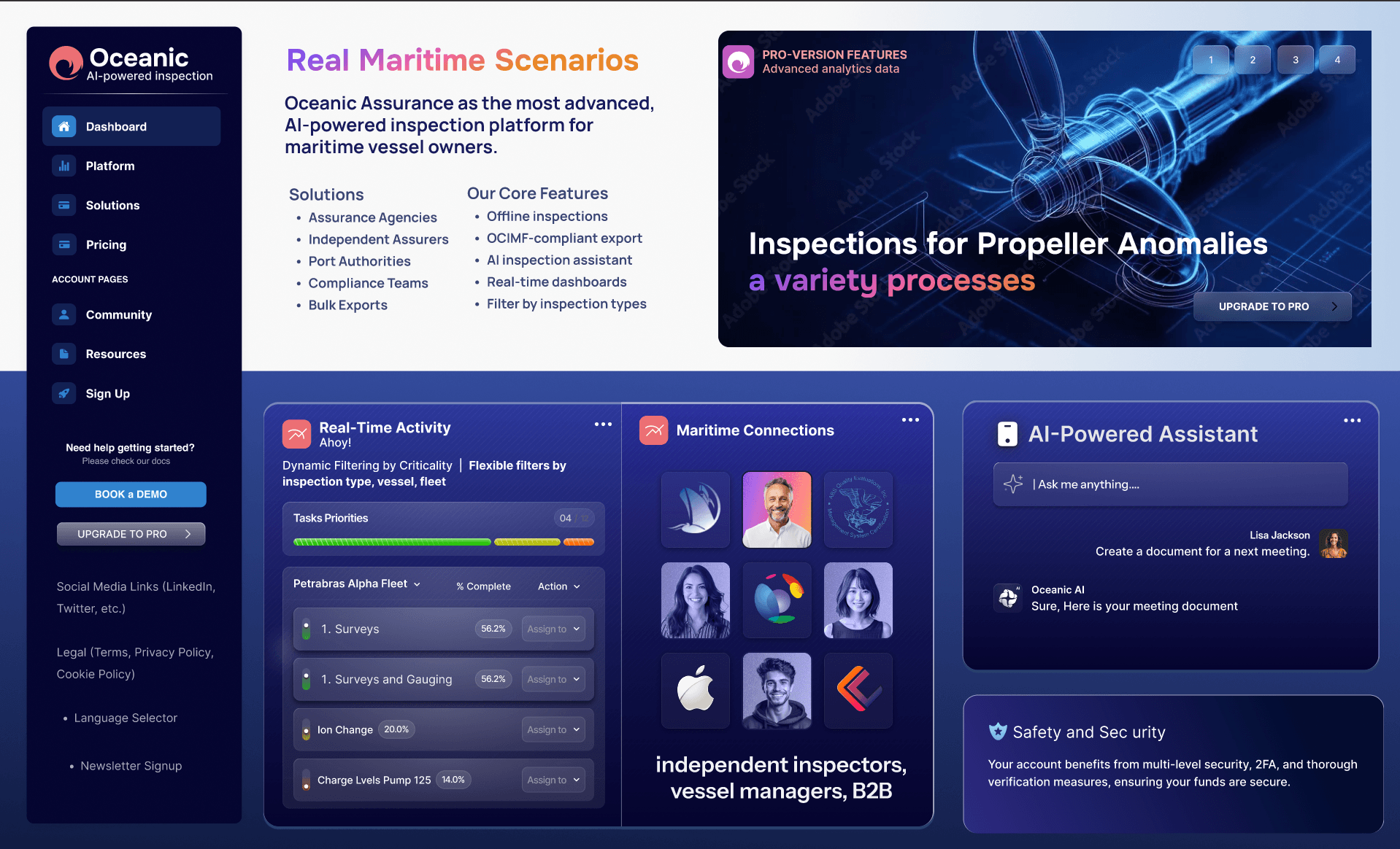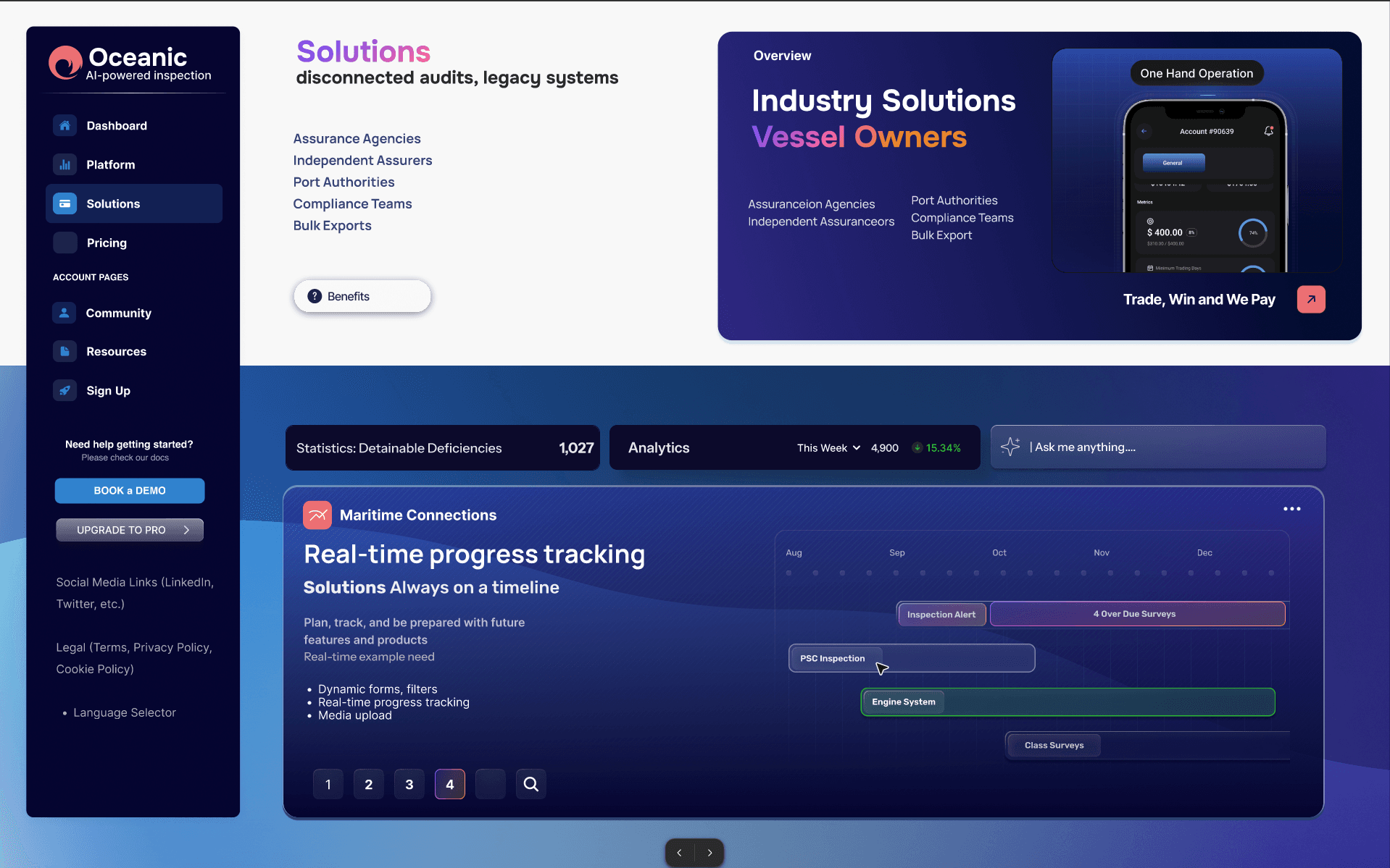 Launching a new SaaS product for maritime: I had full freedom to design the style (bento) of this interface. I did all of these mockups for a freelancer client. I was only given a text outline of features. I prepared a wireframe set of the features then delivered this set of mockups. This client wanted a promotion website for a SaaS application. I included the actual application features in the promotional site.