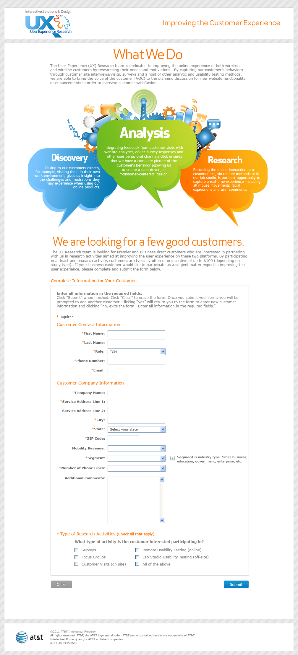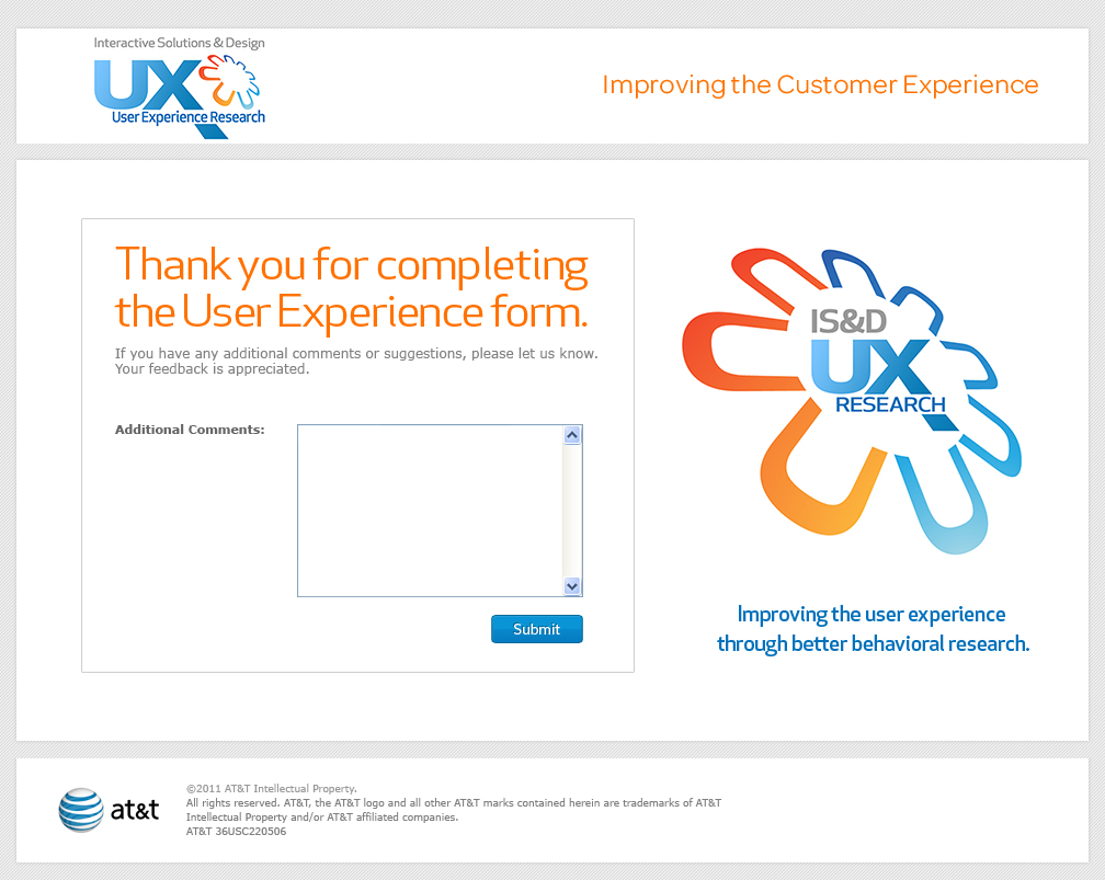 I recruited users for testing our banner ad campaigns. I also designed the logo for our department “Interactive Solutions & Design”.The User Experience (UX) Research team is dedicated to improving the online experience of both wireless and wireline customers by researching their needs and motivations. By capturing our customer’s behaviors through customer site interviews/visits, surveys and a host of other analytic and usability testing methods, we are able to bring the voice of the customer (VOC) to the planning discussion for new website functionality or enhancements in order to increase customer satisfaction. | We are looking for a few good customers.The UX Research team is looking for Premier and Business Direct customers who are interested in partnering with us in research activities aimed at improving the user experience on these two platforms. By participating in at least one research activity, customers are typically offered an incentive of up to $100 (depending on study type). If your business customer would like to participate as a subject matter expert in improving the user experience, please complete and submit the form below. |