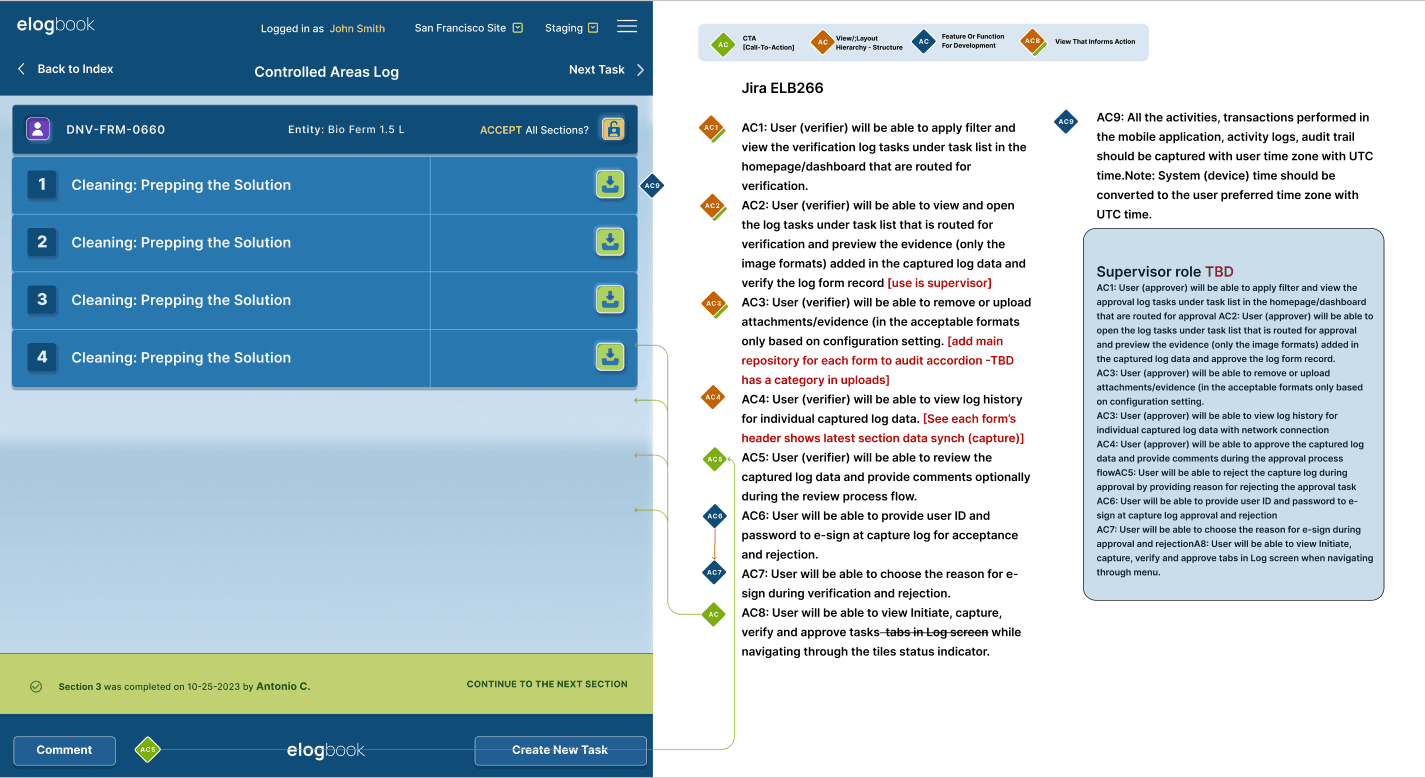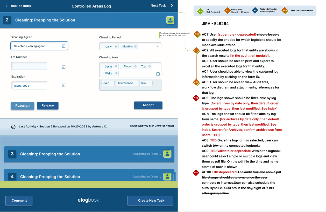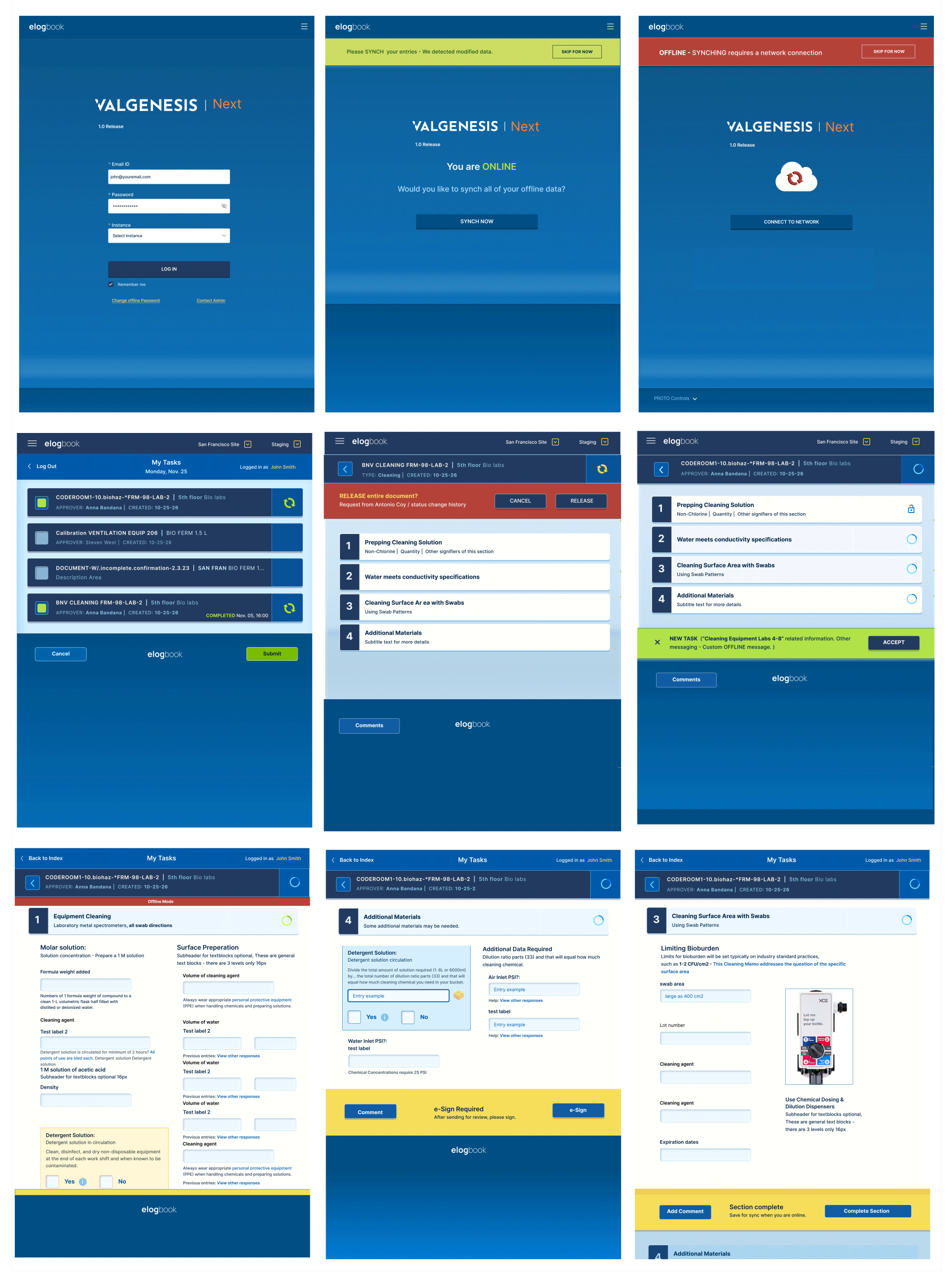 I used hi-fi wires and interactive prototypes to workshop each story and further refine the features. eLogBook is used in labs and closed protected environments. Being off-line posed a unique problem for the design, the app had to cache entries until a connection could be made.