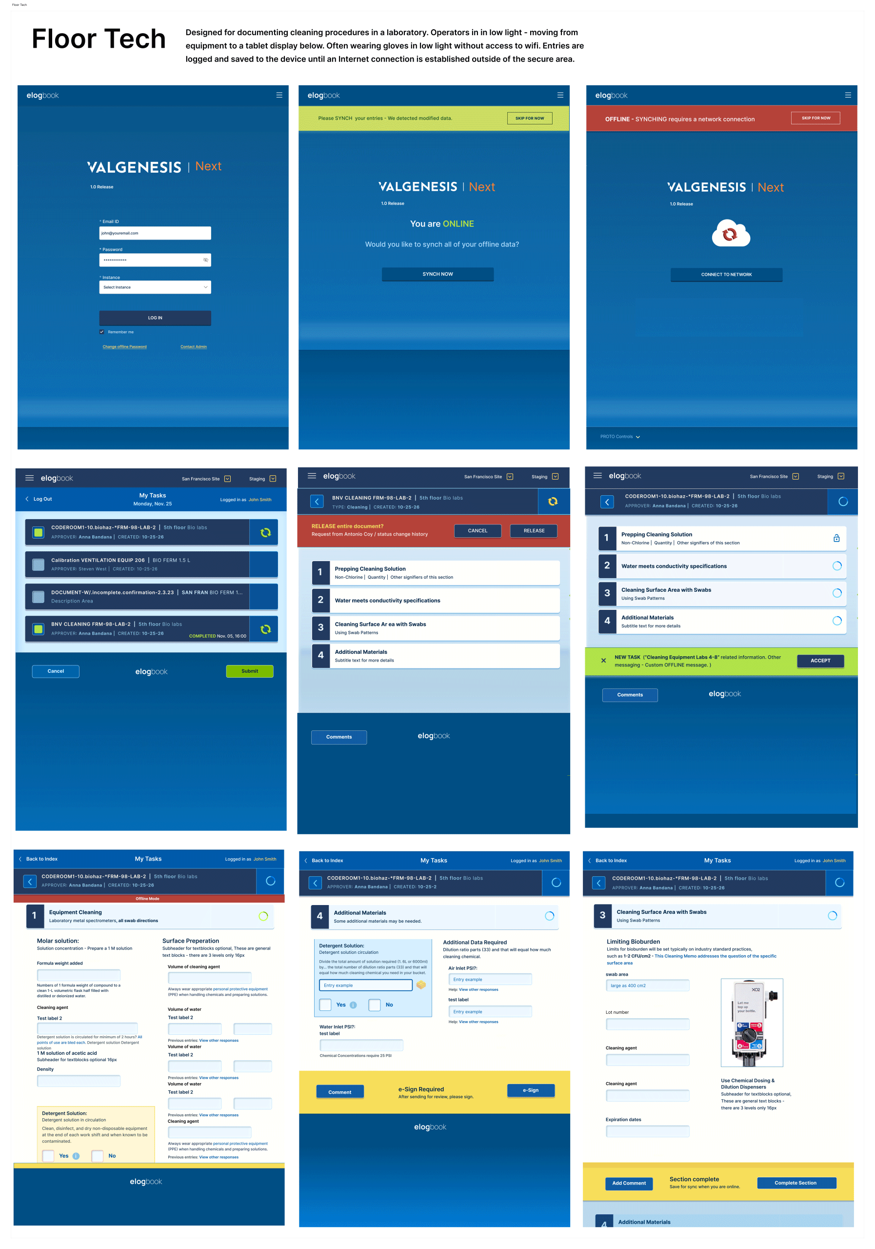 Designed for technicians who are documenting cleaning procedures and incidents in a laboratory. I approached the project with many strong ideas about how document validation interfaces should work. This is a tablet-based application for an environment where there is no wi-fi. The user has to synch entries when reconnected. I think this type of experience can be leveraged for products which cannot always be connected – either for security or range limits. It’s for laboratory techs doing cleaning between processing medications, chemical substances, etc. Accuracy is a core requirement.