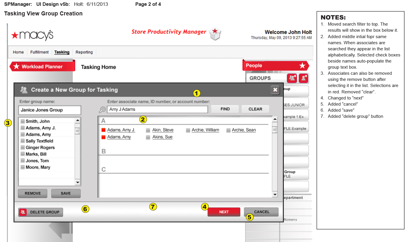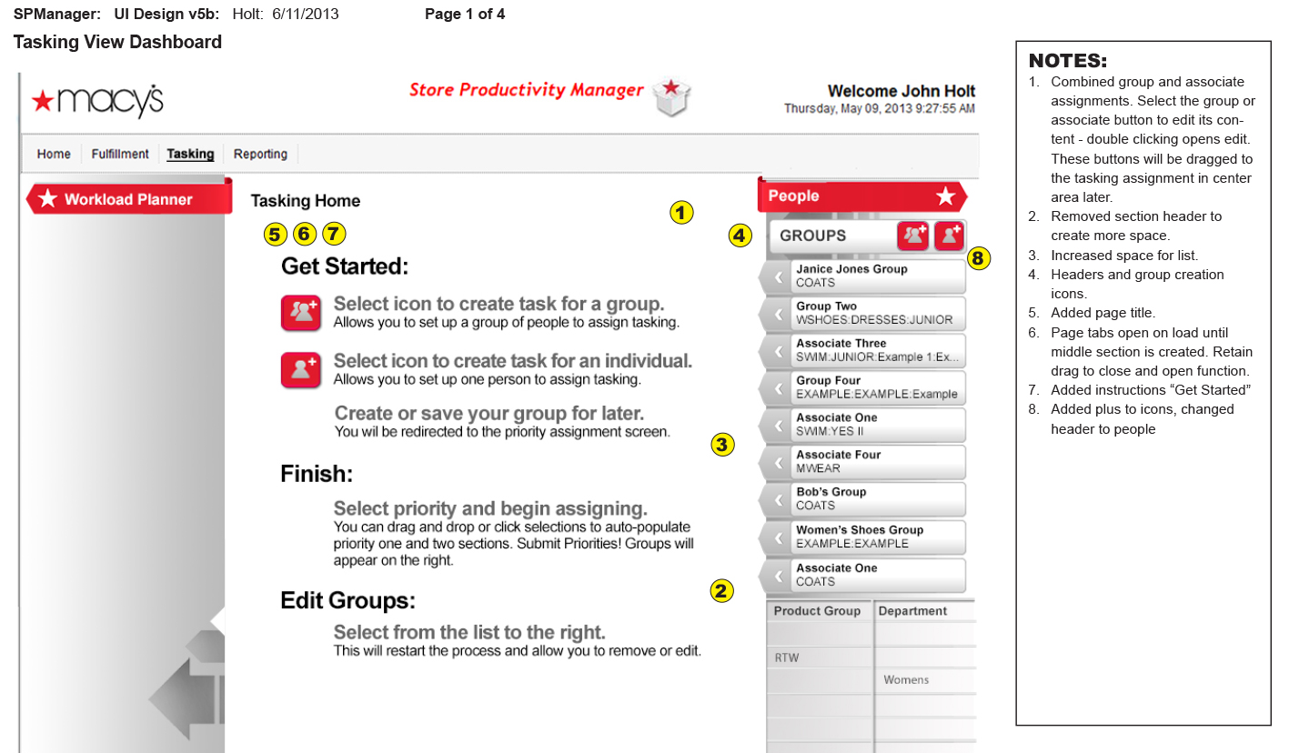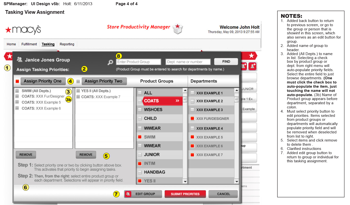 This project shows a task assignment interface for Macy’s Store Productivity Manager, designed to help managers assign task priorities to groups or individuals. Below a user selects a group (e.g., Janice Jones Group), then assign tasks by choosing priority levels (Priority One or Two). They select product groups and departments from lists, which auto-populate priority fields, requiring only one clic.