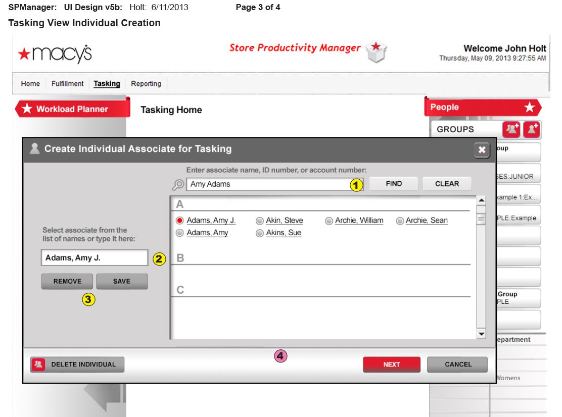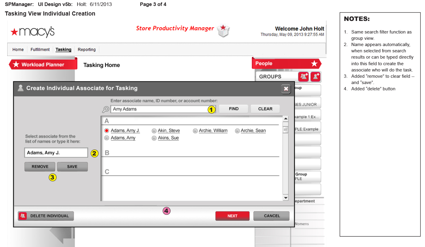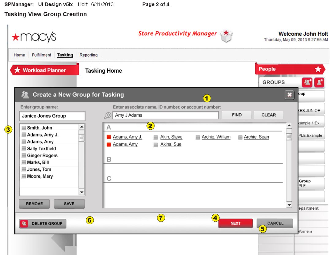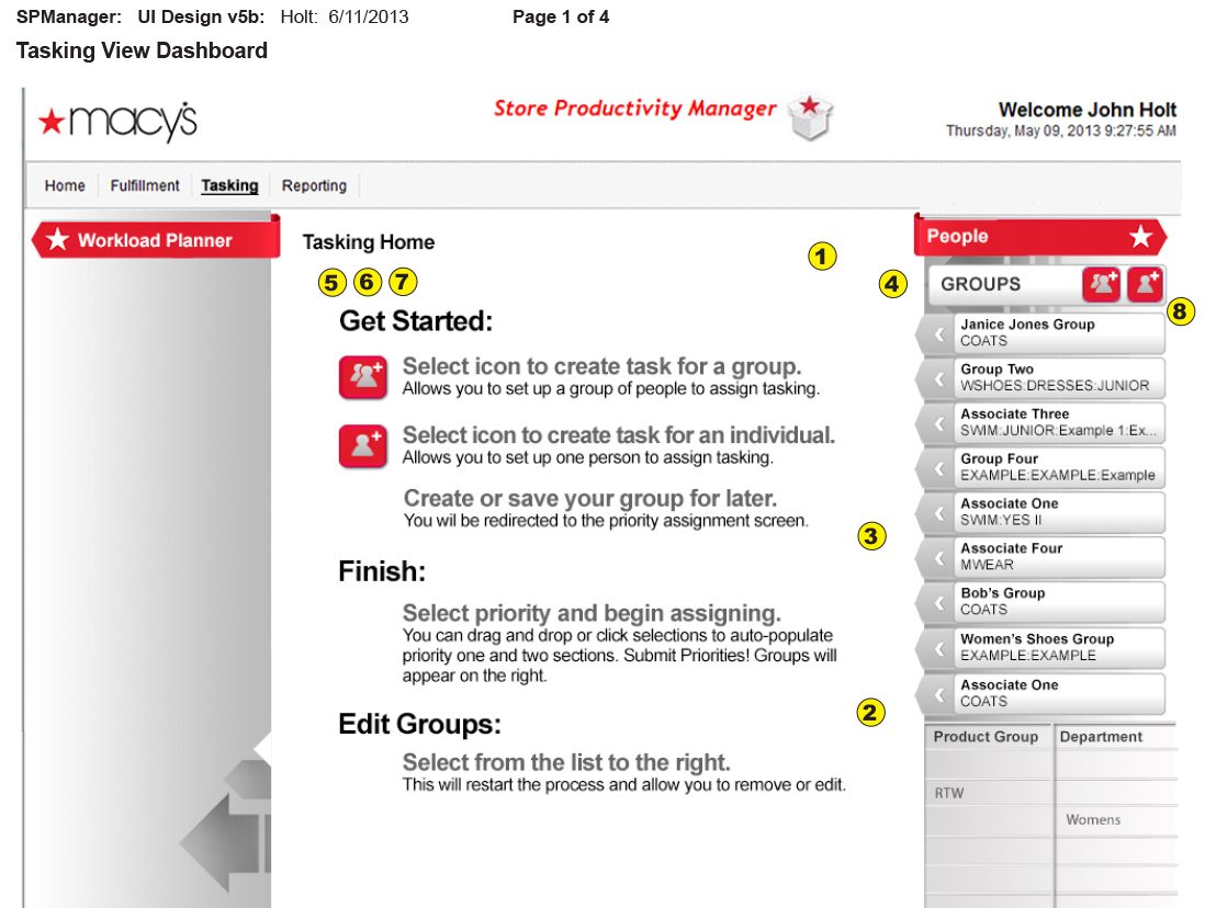This project shows a task assignment interface for Macy’s Store Productivity Manager, designed to help managers assign task priorities to groups or individuals. Below a user selects a group (e.g., Janice Jones Group), then assign tasks by choosing priority levels (Priority One or Two). They select product groups and departments from lists, which auto-populate priority fields, requiring only one clic.