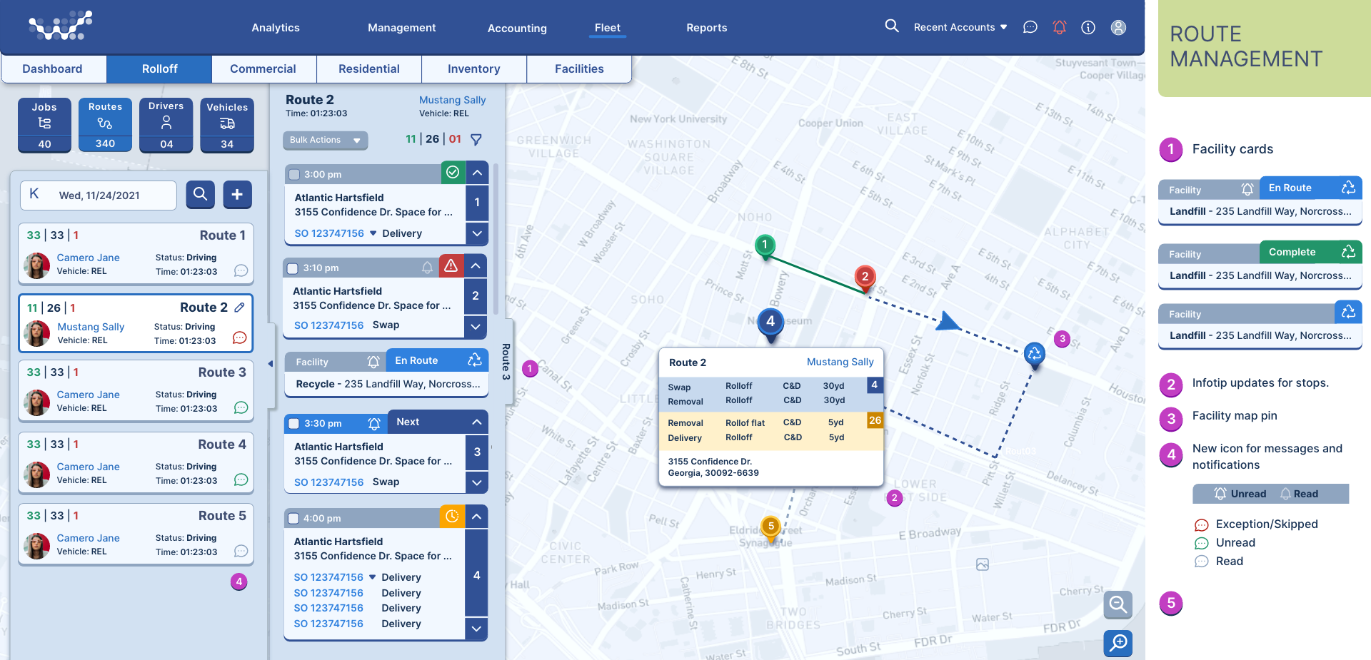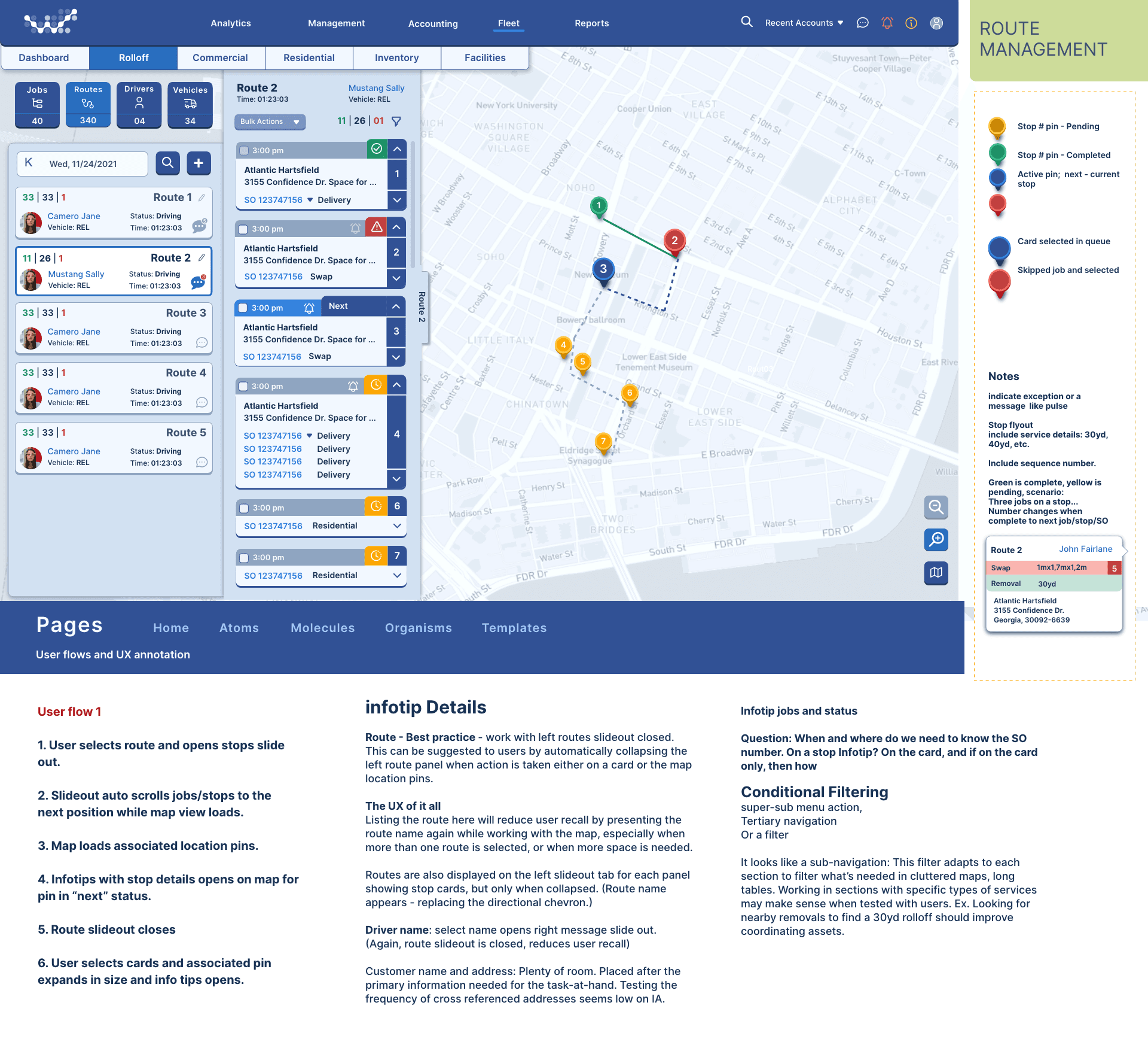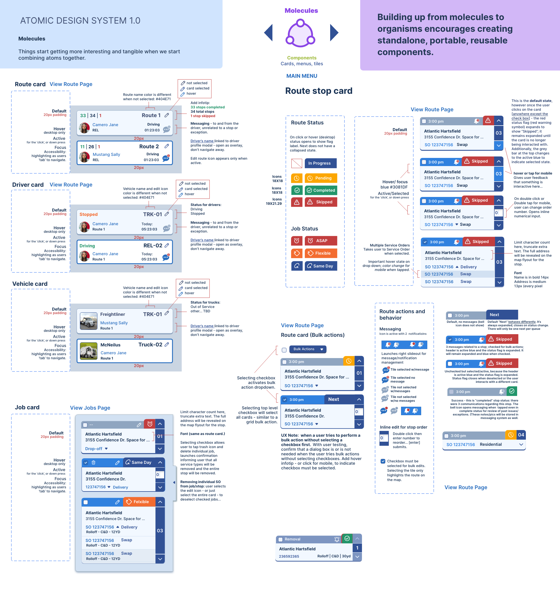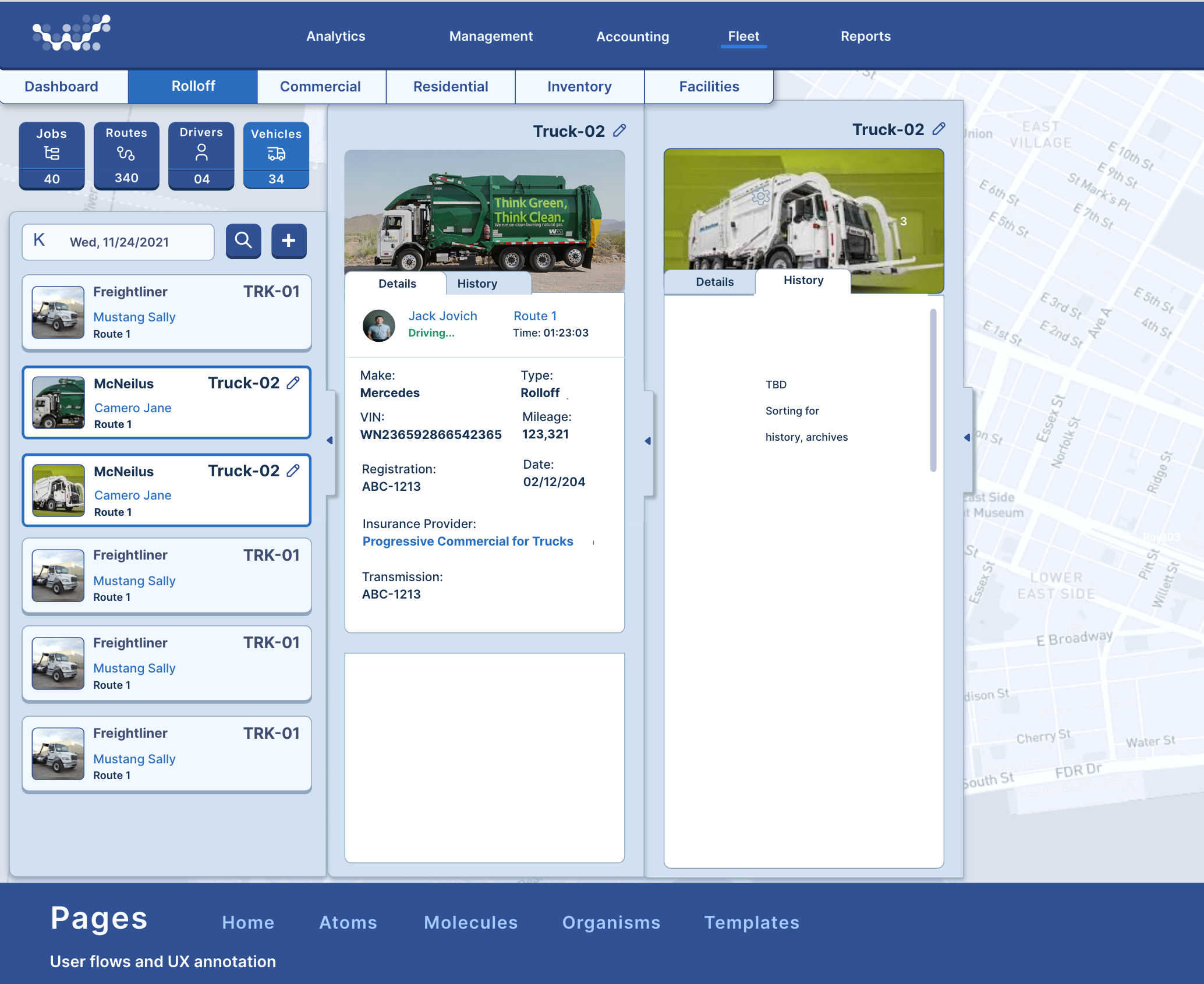 | The project involved designing an innovative mapping and routing solution tailored for the waste management industry, specifically targeting commercial and residential waste services. The goal was to create a mobile-first, touch-friendly interface that uses rich colors and high contrast to clearly communicate important information quickly and effectively. This meant the design had to support complex workflows involving multiple user roles and objectives. Overall, the project required extensive coordination between different system components and user needs to deliver a comprehensive, easy-to-use platform for waste management businesses. Dispatch Coordination Time: Reduced by 60% (25 min to 10 min per route) Route Accuracy: Improved by 40%, cutting down on missed or delayed pickups Asset Utilization: Increased by 30%, ensuring trucks and containers were actively in use Training Efficiency: New dispatcher onboarding time cut from 3 weeks to 1 week Operational Savings: Estimated $250K annual savings per regional hub | Solution The solution was intended for B2B customers, waste management and recycling companies, that require tools for dispatching and routing their fleets, as well as monitoring assets, revenue, vehicle usage, and account productivity. To be sold to waste management/recycling businesses looking for dispatch and routing, as well as, oversight into asset, revenue, vehicle and account productivity. We had to coordinate multiple interactions and objectives of the user to find easy solutions for complex flows, which included a driver app and order tracking. I linked subscriptions to service design for this omni-channel enterprise solution. This requires coordinating service deliveries to work sites through a mobile driver app linked to dispatch. |